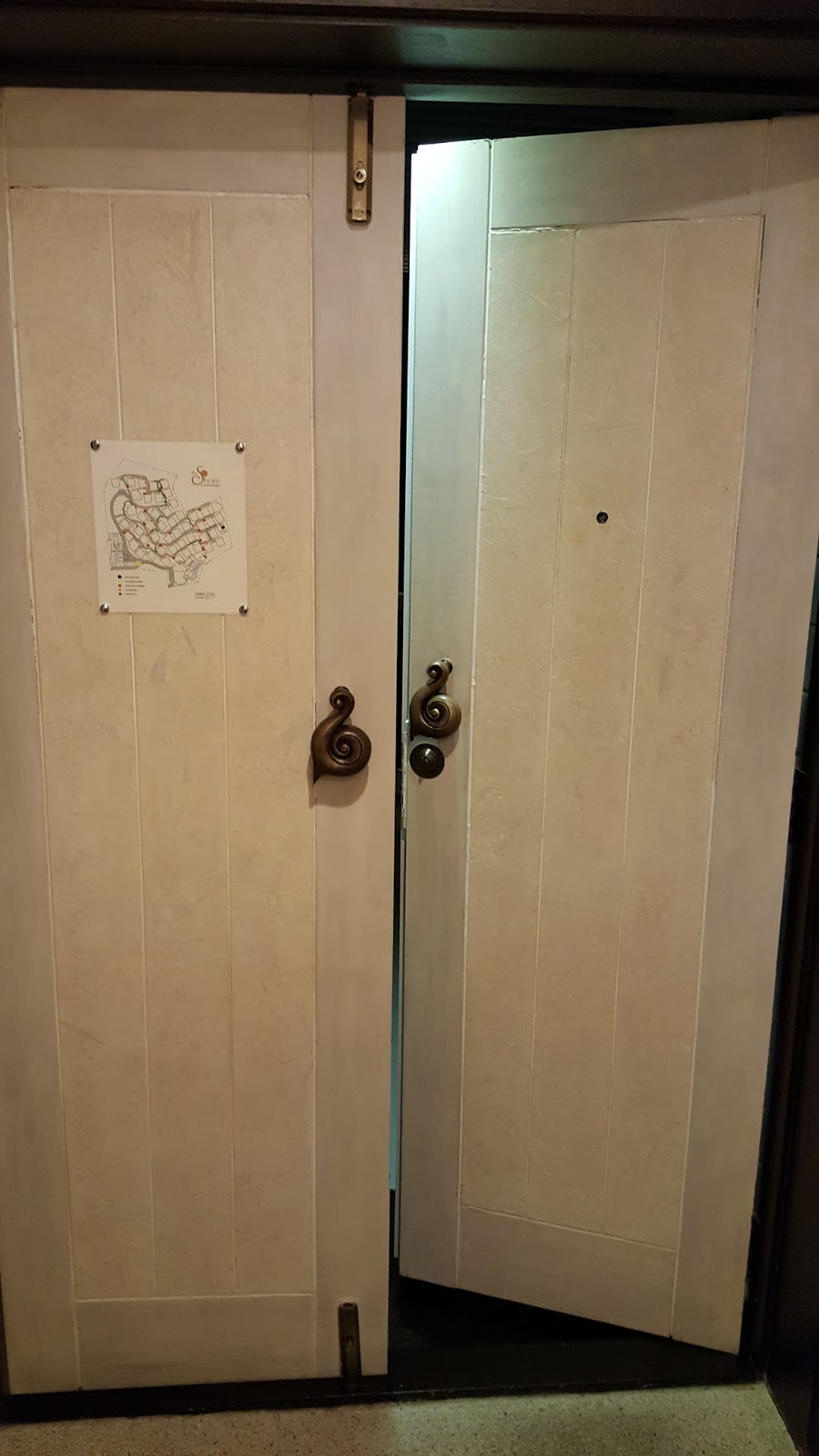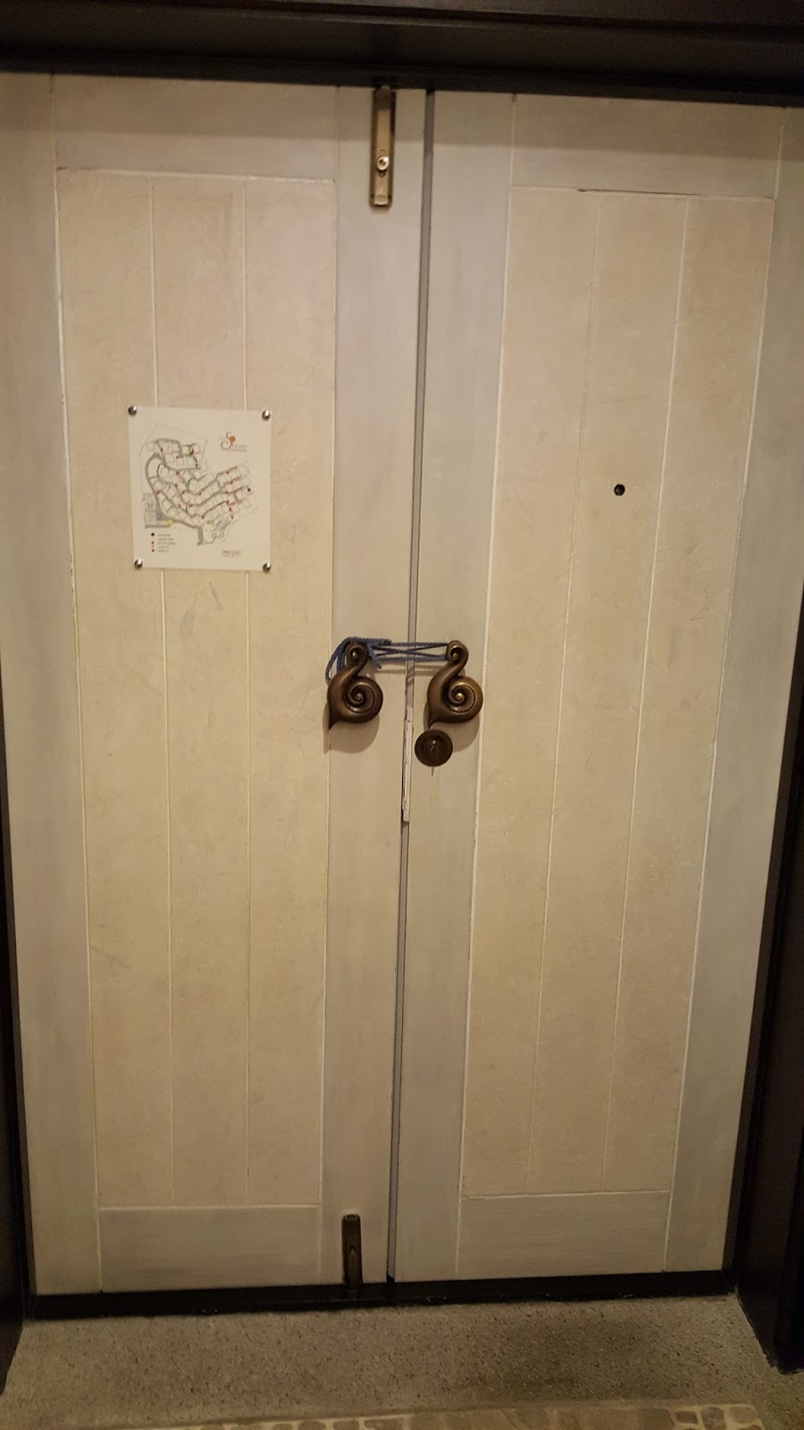 If you look at the very nice double doors you can see there are double bolts on the left side door and a latch on the right side door which fixes it to the left side door. Now one thing the doors do have is a spy hole so at least you can see who is on the other side. Both doors open outwards.